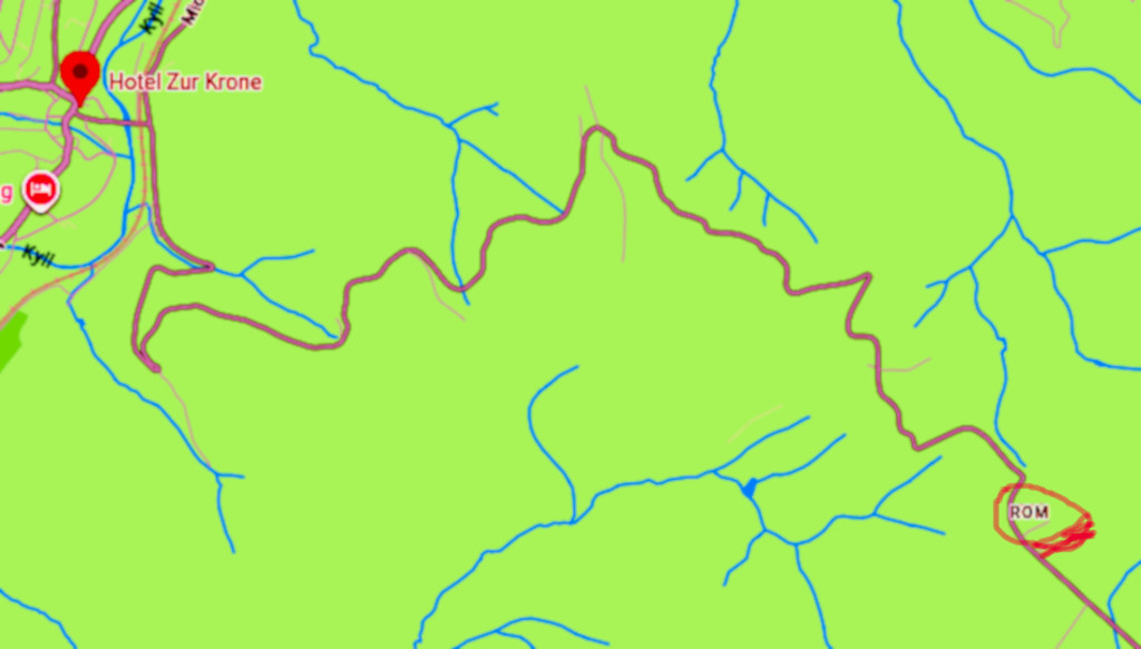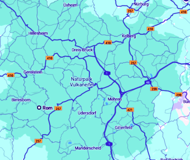 Man kann danach Rom sehr schnell erreichen. Nur in rd. 5 Auto- oder Motorrad-Minuten. Es geht zunächst auf der B 257 weiter, bevor man zwei Mal abbiegt. Erst nach rechts in Richtung Salm, dann weist ein Straßenschild (s.o.) nach links. Der letzte Stück nach Rom ist eine lange Gerade. Dann sieht man schon das Straßenschild und wenige Häuser. Wenn man in eine Dorfstraße abbiegt, merkt man, dass die „Römer“ noch mit dem Straßenbau nicht so weit sind. - Rom wurde eben nicht an einem Tag erbaut!
