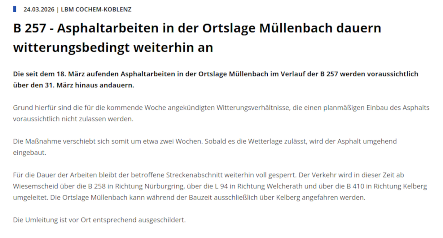 Wer von Süden kommend, über die A 48 kommt und die Ausfahrt „Ulmen“ nutzt, wird im Verkehr auf der B 257 – wie man auch dem Foto entnehmen kann - in Höhe von Müllenbach evtl. durch noch nicht abgeschlossene Straßenarbeiten ein wenig behindert.