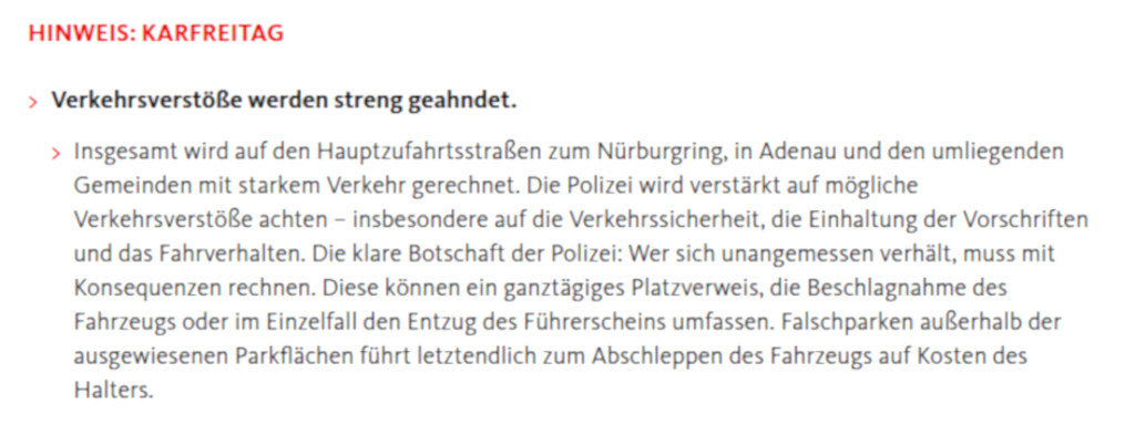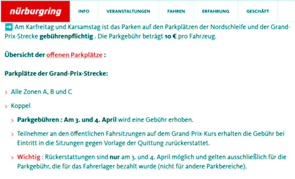 Auf der Internetseite des Nürburgring las sich die Notiz mit dem Hinweis auf Parkgebühren so: