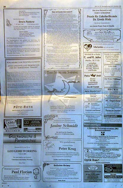 Es stand im "Kölner Stadtanzeiger". Auf einer der Seiten, auf der man auch evtl. noch eine Todesanzeige findet (weil sie irgendwie nicht mehr auf die "richtige" Seite passte. Da findet man auch die Anzeige eines Beerdigungsinstituts, eine Praxis verkündet ihr erfolgreiches Bestehen, es finden sich auch Geburtsanzeigen oder man sucht einen Unfallzeugen. Solche Zeitungsseiten sind wie das wirkliche Leben: bunt, gemischt, todtraurig, lustig. Und dann steht dort... - aber ich zeige Ihnen das mal als Kopie: