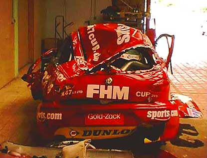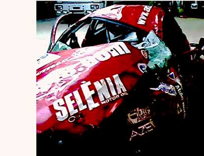 Die Rohrstärke war unwesentlich größer als die Dicke einer Zigarettenschachtel. Da fragt man sich, wer für einen solchen "Käfig" ein Zertifikat ausstellt. Entsprechend sah natürlich das Fahrzeug aus. Aber man muss auch festhalten: die einwirkenden Kräfte waren beim mehrfachen Überschlag sehr hoch. So sah das Fahrzeug von vorne aus: