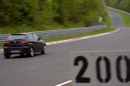 ...auf einen 7er BMW aufgelaufen ist. Der Fahrer des BMW kann es gar nicht fassen, dass dieser Auto-Zwerg es wagt ihn anzublinken. Und der "R"-Ibiza ist dann auch vorbei gezogen. Ich habe den Diesel-Ibiza (der hat tatsächlich ein Sechsganggetriebe, während das Turbo-FR-Modell sich mit einem Fünfganggetriebe begnügen muss) auf einer seiner schnellen Runden mit 9:15 min stoppen können. Und bei Regen hatte der "Kleine" auf der Nordschleife nur noch wenig Konkurrenz. Das machen nicht die 150 PS des Diesel, sondern wie man sie - dank des gewaltigen Drehmoments - (das ich leider nicht exakt kenne) einsetzen kann. Immer (mindestens) einen Gang höher fahrend, als die Benzin-Konkurrenz unterwegs, war der "Kleine" auch dank seines relativ geringen Gewichts (um 1150 Kilogramm) das leichter, besser und schneller zu fahrende Fahrzeug auf der glatten Fahrbahn als die PS-starken Zweitonner.
