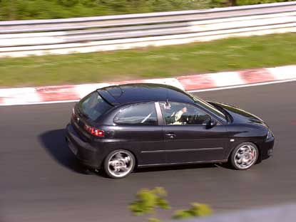 Aber nun zum "Brudermodell", dem SEAT Ibiza R "D" (so nenne ich ihn). Ich habe ihn bei einer abschließenden letzten Dauererprobung (bevor über das Anlaufen seiner Fertigung entschieden wurde) viele Tage auf der Nordschleife beobachten können.