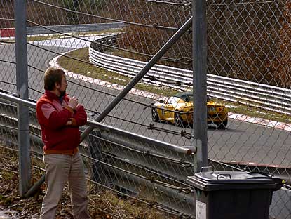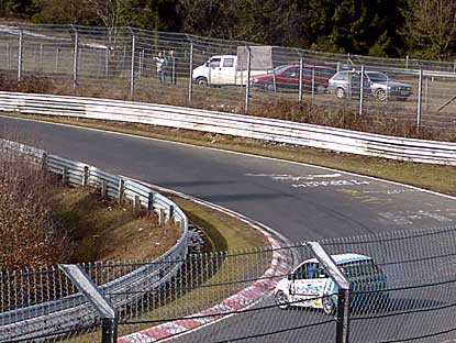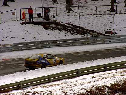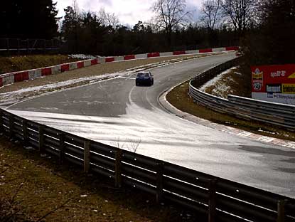 ...wo das Wasser über die Straße lief und die Fahrzeuge Fahrspuren hinterließen. Gefährlich! - Aber gefährlich waren diese Bedingungen vor allem für jene, die noch über keine große Rennerfahrung verfügen. Und da hat es dann halt geknallt! - Bumm! - Da flog ein Porsche ab, ein BMW M 3, ein Peugeot 306 - eigentlich alles überflüssig, wie auch der Dreher...