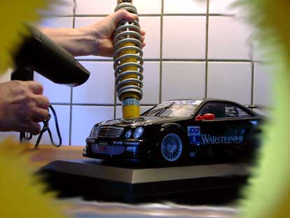 Ich wollte mal mit einem Bild beginnen. Mit einem "gestellten" Foto. Das aber dem Betrachter etwas sagt. Und das er dann einer neuen Geschichte (im Inhaltsverzeichnis links) zuordnen kann. Aber die Auflösung gibt es erst beim Lesen der Geschichte. Oder können Sie sich auch so vorstellen, was ein Fön mit einem Renntourenwagen und Stoßdämpfern zu tun hat? - Es macht Spaß mal ernsthaft darüber nachzudenken, bevor man dann die Auflösung serviert bekommt. - Wetten? - Sie kommen nicht drauf.