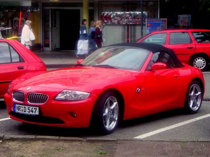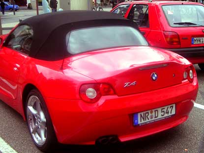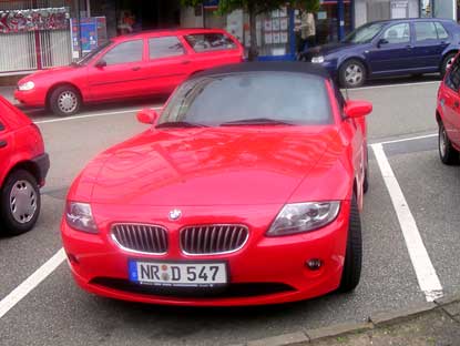 04-07-07/02. - Ich erinnere mich noch genau, dass ich bei den vielen "Erlkönigen" dieses Modells BMW Z4, die ich über lange Zeit beobachtet habe, immer überlegte, was wohl "Tarnung" war, was wohl der kommenden Linie entspricht. Eigentlich ist der Z4 noch der "klarste" von allen neuen BMWs geworden. Aber er wirkt nicht in Silber, er wirkt nicht in Schwarz, weil das keine Farben sind, die seine kühnen Linien unterstreichen. Ein freches Rot: Ja. Dieses Auto braucht "kühne Farben". - Hier ein Beispiel, zufällig auf einem Parkplatz fotografiert: