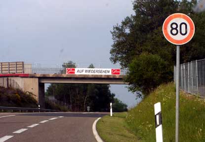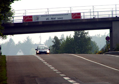 Man biegt dann nach links - auf die B 258 - in Richtung Nordschleife ab (wo die Höchstgeschwindigkeit 80 km/h nicht überschreiten sollte), schaltet weich in den zweiten, dritten, vierten... - ach, so ein Ferrari hat so viele Gänge - und rollt dann "Allegro non troppo" (vielleicht auch "Andante") über den Buckel unter der Brücke...