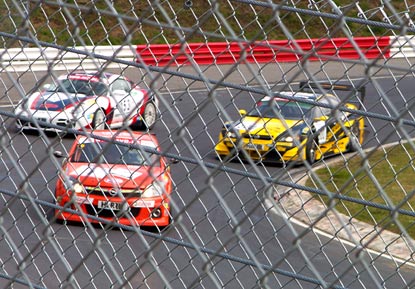 Verglichen mit den Rennen im letzten Jahr (als die Schranke noch die Zufahrt verriegelte) ist hier oben "richtig Betrieb". So um 200 Leute beobachten hier das Rennen und um 100 Automobile sind hier geparkt. Bleibt man oben auf dem Parkplatz, hat man noch eine einigermaßen gute Sicht auf die in die erste Linkskurve fahrenden Automobile - über den Zaun hinweg. Geht man dann näher heran, hat man folgendes Bild: