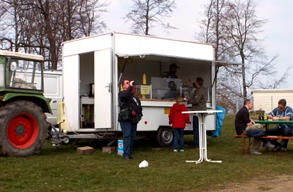 08-05-05/05. - Während wir uns ein frisch gebratenes Rotbarsch-Filet zu Munde führen, hören wir die sich überschlagende Stimme des Streckensprechers, der uns den Start der Spitzengruppe schildert. Danach saust man jetzt breit gefächert - "in einer Sechserreihe" - auf die erste Kurve zu. Meine Frau schaut mich an und fragt: "Und was macht jetzt dein Bruder". - Ich sage: "Der ist ein richtiger Rennfahrer. Da mache ich mir keine Sorgen. Der kann auch noch beim Fahren denken und richtige Entscheidungen treffen".