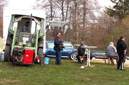 ...zwei Zuschauer-Automobile stauen. - Ich fahre hinauf zur Tankstelle "Döttinger Höhe" wo ich auf eine Reihe von "Langstrecken-Fans" treffe. "Und?", frage ich - und stelle die Frage nach dem persönlichen Eindruck, was das Zuschauerinteresse betrifft. "Nicht los", meint man. Was eigentlich unverständlich ist, weil um 230 Fahrzeuge genannt hatten, das Wetter hervorragend war.