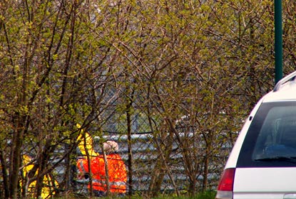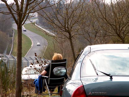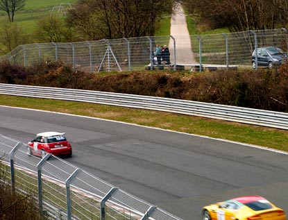 Aber ich muss hier noch auf eine Besonderheit dieser Stelle aufmerksam machen. Hier gibt es sogar zwei Zäune, vorne den FIA-Sicherheitszaun, dahinter den alten Zaun. Wenn man nun vorne am Zaun steht und es regnet, dann kann man theoretisch die Fläche zwischen den beiden Zäunen mit einer so genannten Waggondecke überspannen und - steht im Trockenen. - Das vielleicht als Tipp für Besucher des 24-Stunden-Rennens.