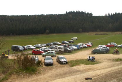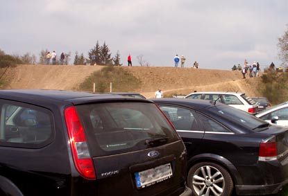 An der "Hohen Acht" ist praktisch nichts los und auch hinunter nach Adenau findet sich kaum (z.B. am "Bergwerk") ein Zuschauerfahrzeug, weil auch hier die Schranke geschlossen ist. Am "Wehrseifen" sind dann zwar auf der schmalen Straße bergauf eine Reihe von parkenden Fahrzeugen festzustellen und oben auf dem quer verlaufenden Feldweg sieht es dann so aus: