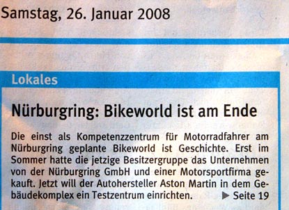 Auf der Rückfahrt komme ich an der "BikeWorld Nürburgring" vorbei. Sie erinnern sich? - Ich erinnere Sie gerne mit einem Ausschnitt aus der "Rhein-Zeitung":