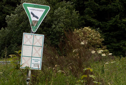 ...dass ich ein Landschaftsschutzgebiet betrete. Was ich im Detail darf - oder nicht darf - ist auf dem verblassten Schild nicht mehr so recht auszmachen. Aber mir fällt ein, dass die Nürburgring GmbH in diesem Gebiet als "Ersatz" für ein an der B 258 vor zwei Jahren neu "versiegeltes " Gebiet (von BMW bezahlt) ein "Ersatzgebiet" ausgewiesen hat. Das ist nach den Gesetzen und Vorschriften des Landes Rheinland-Pfalz möglich. - Wer fragt da nach dem Sinn?