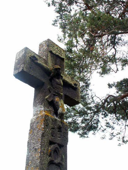 Es ist immer noch dasselbe Kreuz. Nur der Gesamteindruck im Umfeld hat sich deutlich verändert. Nur das Kreuz, dessen Stabilität man (auf der Rückseite) durch ein Flacheisen gesichert hat (hoffentlich TÜV-geprüft!) ist praktisch unverändert. Die Details des "Schwedenkreuz" sind - wenn es in ein großfläches Foto gestellt wird - nicht so ausmachen kann. Darum sei hier der obere Teil des Kreuzes....