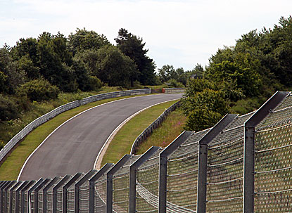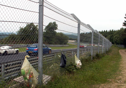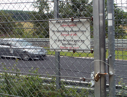 ...erinnert dann wieder an die Realität. Ein stattlicher Zaun zerstört den Eindruck von einer stimmigen Eifel-Landschaft. Ein FIA-Zaun. Niemand hat ihn gefordert (zumindest ist mir niemand bekannt), aber jemand hat ihn bauen lassen. Unklar ist mir der Sinn, da er z.B. an wesentlichen Stellen nicht die Sicherheit der Fahrer verbessert. In jedem Falle verschlechtert er die Sicht der Zuschauer. Was man gerade beim ersten Langstrecken-Rennen nach dem 24-Stunden-Rennen schon deutlich merkte. "Es war nichts los", sagt ein Geschäftsmann. Ein anderer, der nur mal kurz zum Start ans "Brünnchen" fährt stellt fest: "Das war zum ersten Mal, dass ich nicht nach einem Parkplatz suchen musste. Dieses Mal war die Straße (die 412 in Richtung Kempenich) nicht zugeparkt."