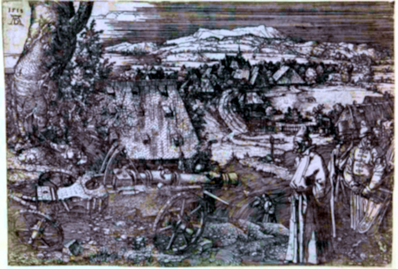 Diese Radierung trägt die in allen Zeiten als eindrucksvoll empfundene Bezeichnung, „Landschaft mit Kanone“ und entstand etwa 1518. - Natürlich „nach Christi“! Diese Art einer Radierung wurde als „Eisenradierung“ bezeichnet. Die meisten Radierungen sind dagegen von Kupferplatten abgezogen. Eisenradierung sind schon etwas Besonderes. Aber es gibt – gerade aus „damaliger Zeit“ – auch noch die Stahlradierung.