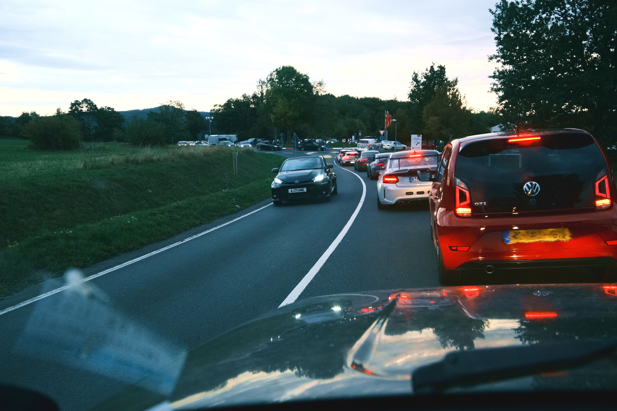 Es war eine Fahrzeugschlange. Ich stand in einem Stau, der sich langsam, ganz langsam – und immer wieder mal länger stauend, auf den Kreisel an der Nordschleifen-Einfahrt zu bewegte. Das ging deshalb so langsam, weil auch eine größere Anzahl von Automobilen versuchte, von dem der Einfahrt gegenüber liegenden Parkplatz auf das Nürburgring-Gelände zu fahren.